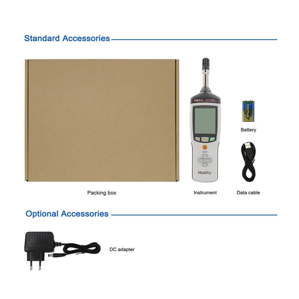 Termometer dan higrometer genggam seri HUATO HE710 adalah alat pengukur suhu dan kelembapan yang cepat, andal, dan sangat akurat. Alat ini dilengkapi dengan layar LCD besar dan desain yang elegan. Semua alat seri HE telah dikalibrasi menggunakan kalibrator termokopel FLUKE. Pelanggan dapat memilih berbagai opsi sesuai kebutuhan mereka. Alat genggam ini dirancang untuk pengukuran di lingkungan dengan perubahan posisi, model sensor eksternal dilengkapi kabel standar sepanjang 1,5 meter, cocok untuk penggunaan ergonomis, bertenaga baterai, dan portabel. Model internal juga dapat mengukur titik embun dan suhu basah.